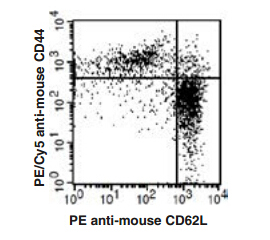 CD44 is a 80-95 kD glycoprotein also known as Hermes, Pgp1, H-CAM, or HUTCH. It is expressed on all leukocytes, endothelial cells, hepatocytes, and mesenchymal cells. As B and T cells become activated or progress to the memory stage, CD44 expression increases from low or mid levels to high levels. Thus, CD44 has been reported to be a valuable marker for memory cell subsets. High CD44 expression on Treg cells has been associated with potent suppressive function via high production of IL-10. CD44 is an adhesion molecule involved in leukocyte attachment to and rolling on endothelial cells, homing to peripheral lymphoid organs and to the sites of inflammation, and leukocyte aggregation.